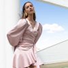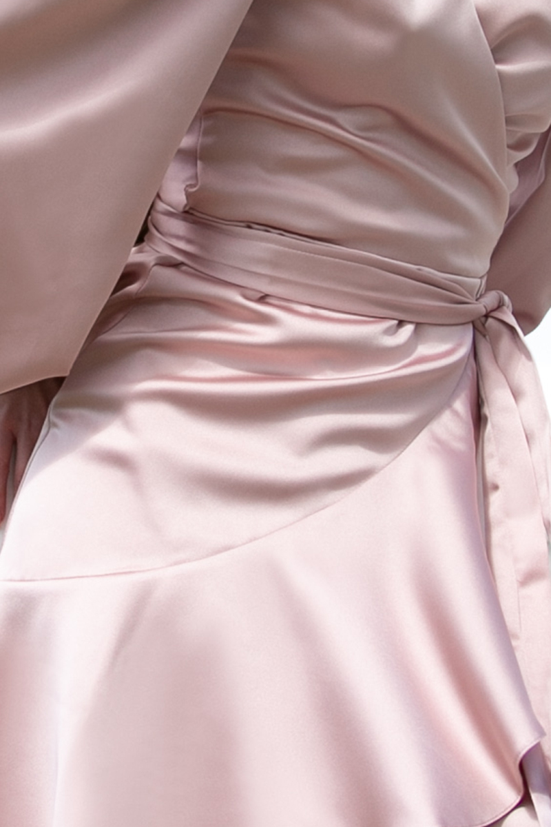 Long sleeves dress with decorative ruffles made of luxury satan (jacquard) for summer days and evenings. The size is for a number smaller than usual, it is recommended to take for a number larger size.